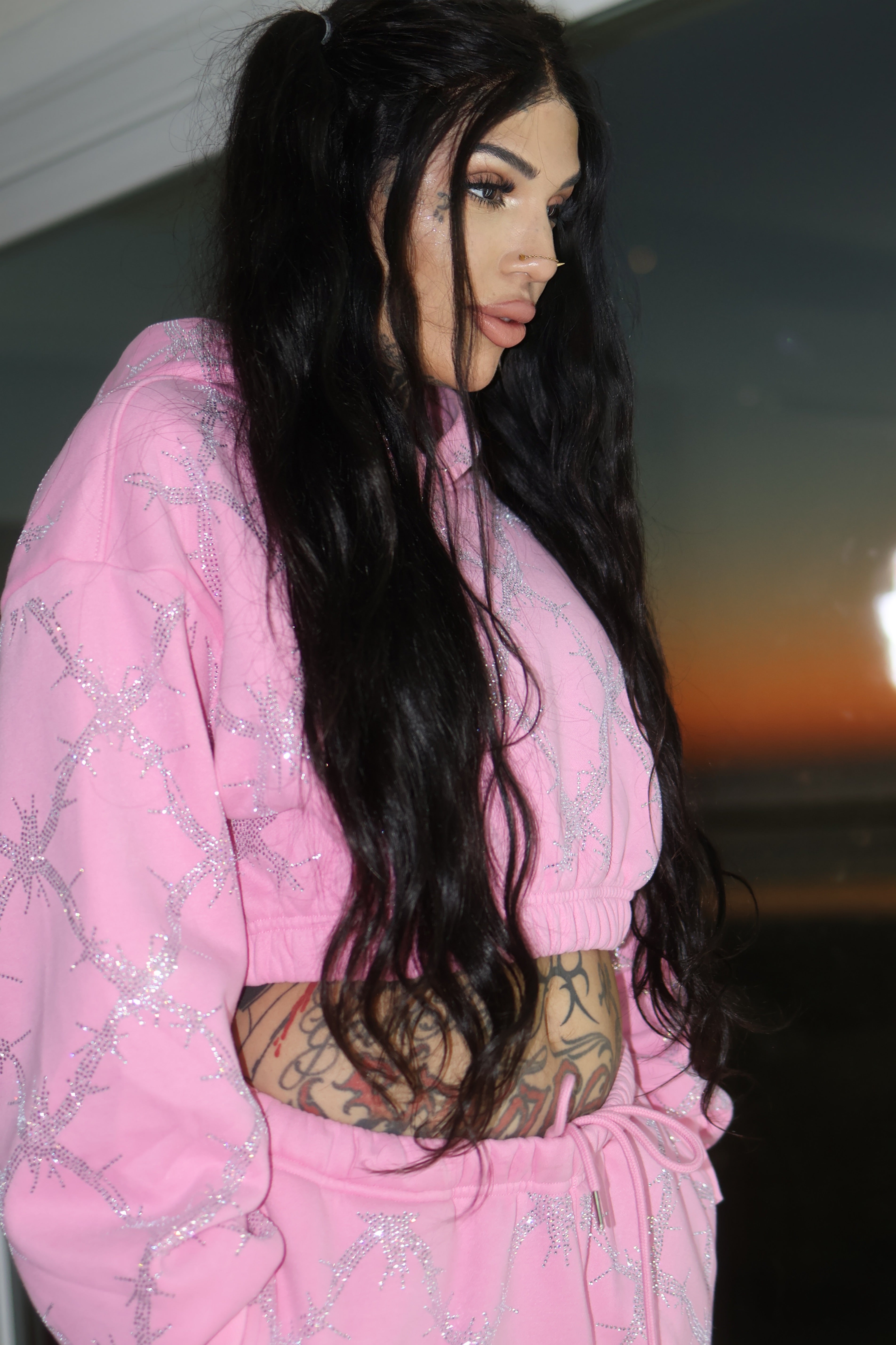 Baby pink barbed wire fence rhinestone crop hoodie