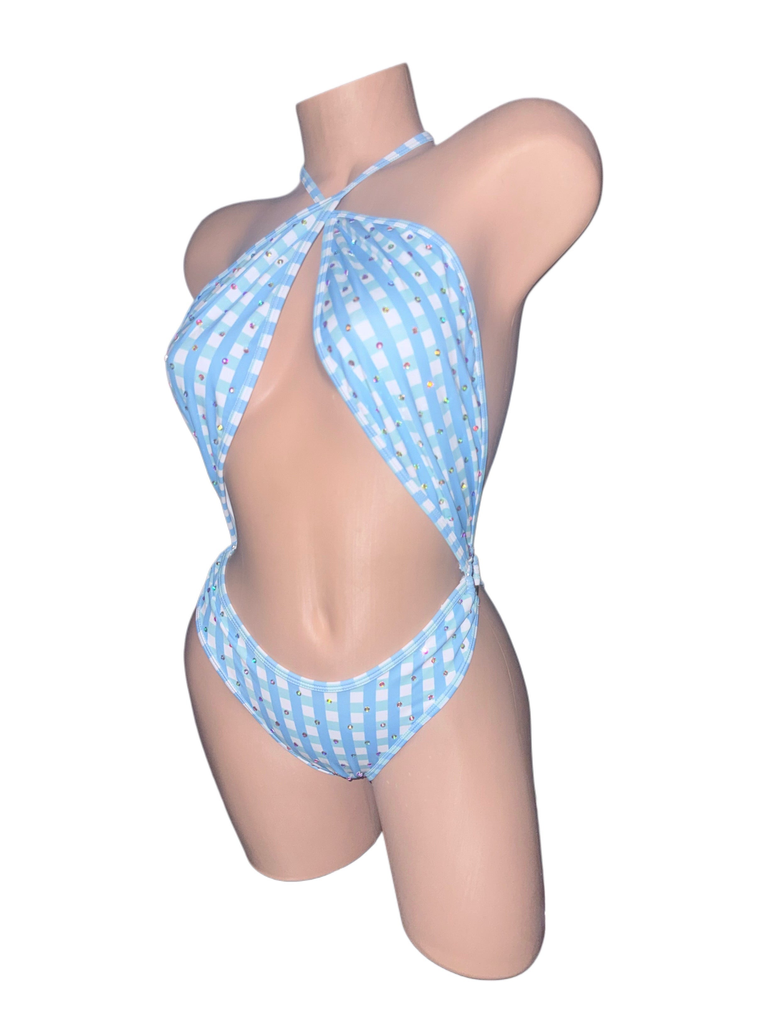 Blue gingham rhinestone ring one piece